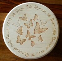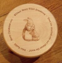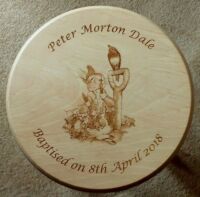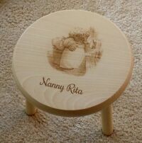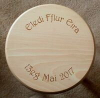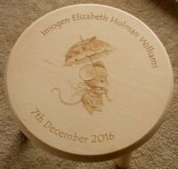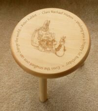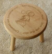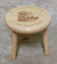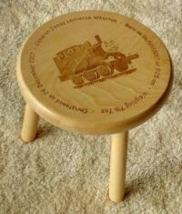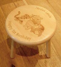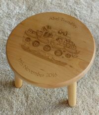 Beech wood stools. The seat measuring 9″ diameter and approximately 9″ high. These can be engraved with anything you like on them.